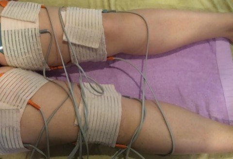 기계를 허벅지, 팔뚝, 복부, 무릎에 총 7군데에 장착을 한 뒤에 저주파를 흘려준답니다.