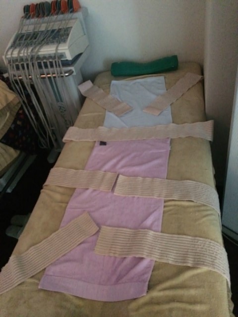 중간에 너무 뜨거워서 수건을 배 위에 올려놓았어요.