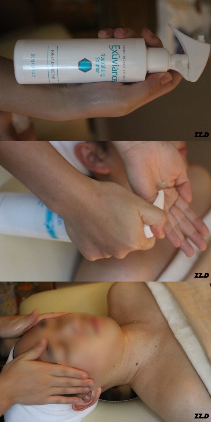 T존-턱-볼-목 순서로 피부 예민도에 따라 2~4분 정도 방치해두어요!