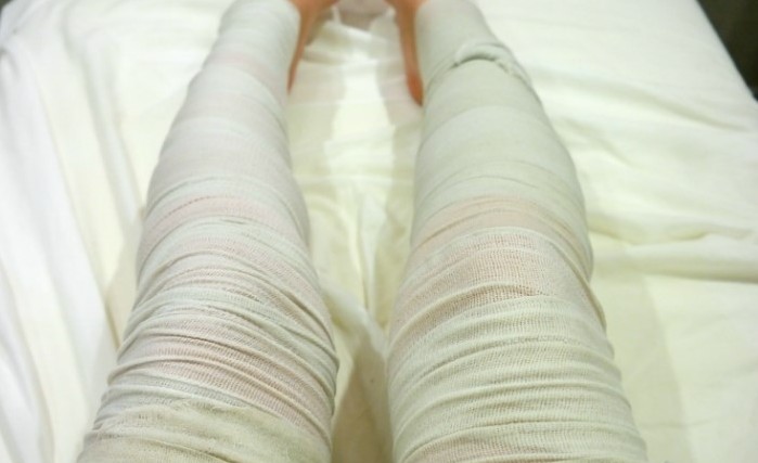 붕대로 감싸 몸의 부종을 빼주고 있는거에요.