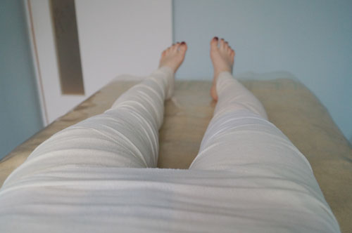 차가운물에 적신 붕대를 하체에 줄줄이 감아서 15분 동안 가만히 누워 있었다.