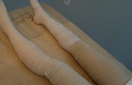 붕대를 제 다리에 전체적으로 칭칭 감고 15~20분 동안 있으면
