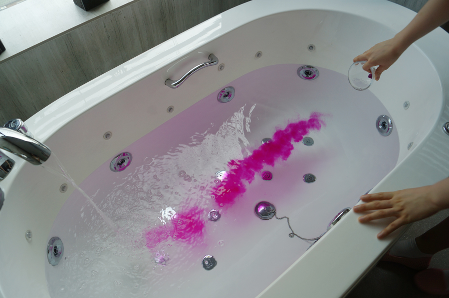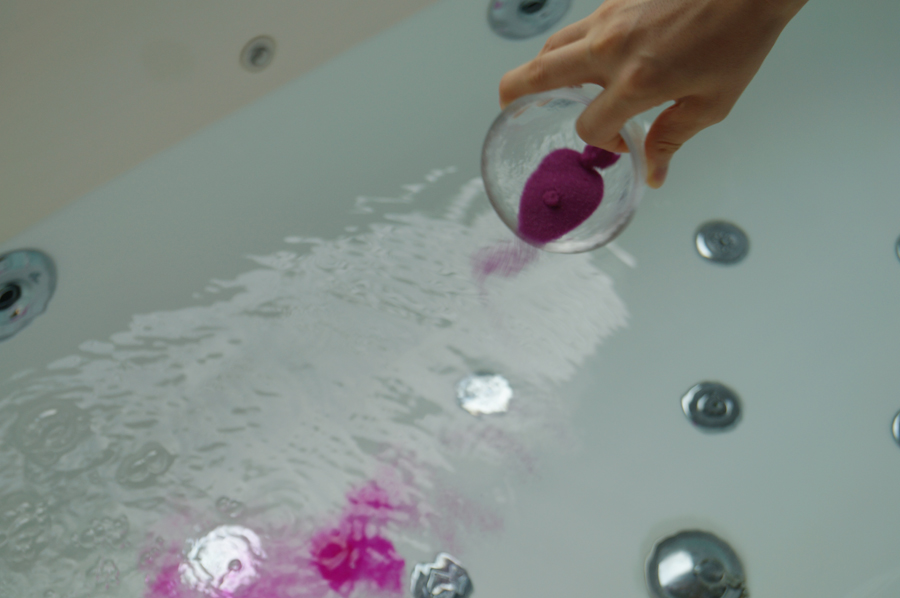 분홍 사해가루를 물 속에 뿌려서 녹아 들어 점점