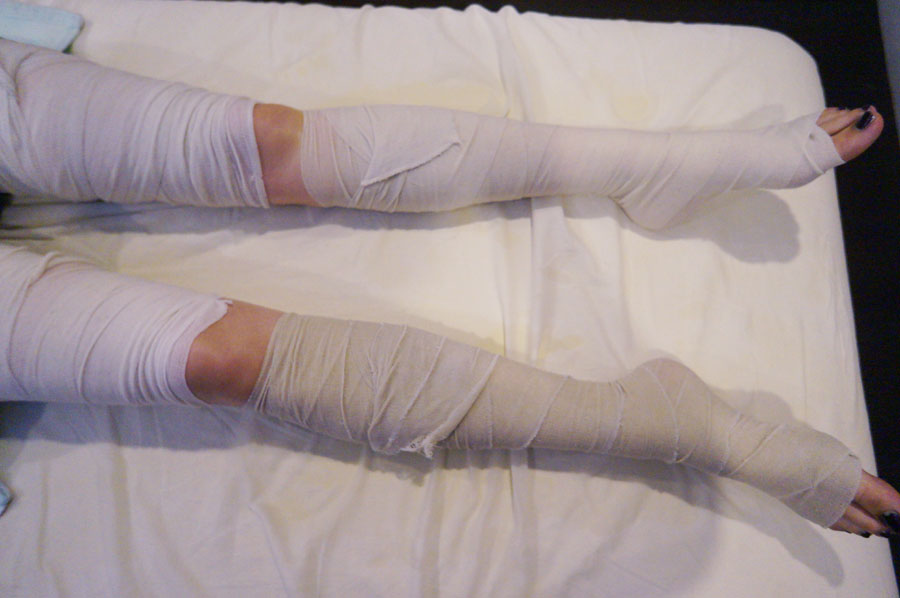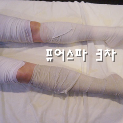 민트향이 나는 로션(?)을 바르고 밴드로 다리를 번데기로 만들어요 ㅎㅎ