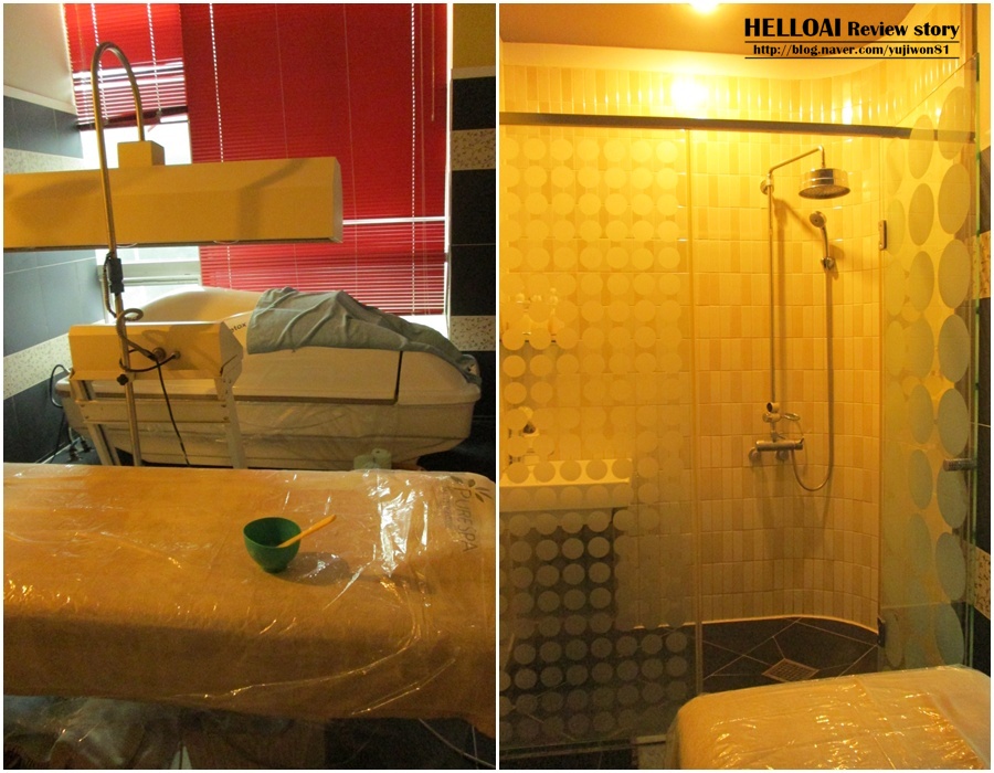 마스크룸에는 샤워실이 있었구요, 전신에 팩을 하는 방이라 베드에도 비닐이 깔려 있었어요.